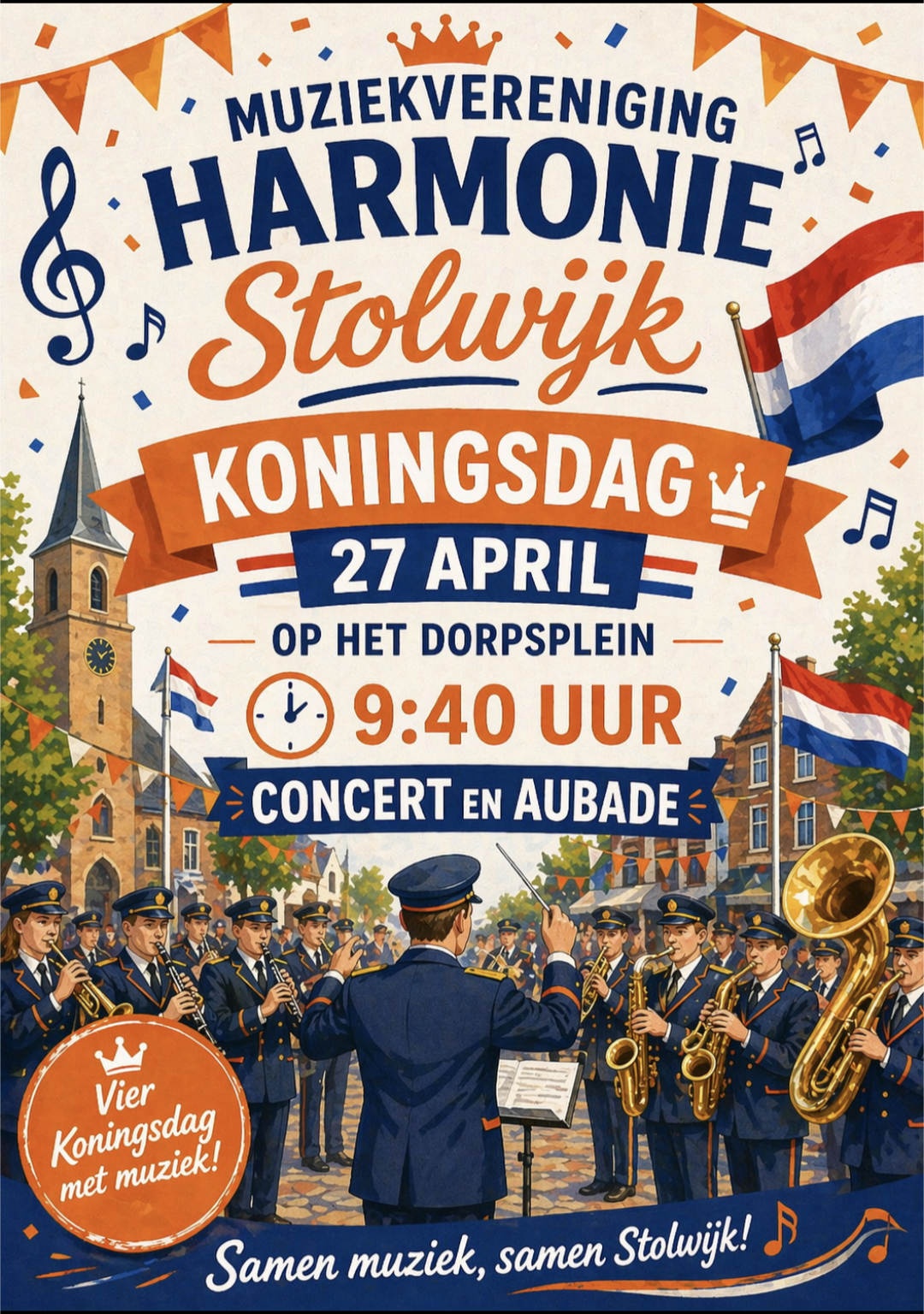 Op 27 april is Harmonie Stolwijk natuurlijk weer van de partij op het dorpsplein!